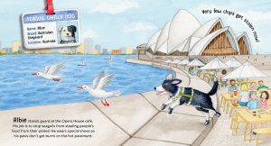 This is a fascinating book for anyone who knows and loves dogs. We learn about Albie who guards the Sydney Opera House cafe. His job is to stop seagulls from stealing people’s food. There’s Dutch who helps nervous patients feel calm in the dentist’s chair. There’s  a beekeeper dog, a water rescue dog, a school companion dog and Eba, the fascinating whale poo dog, whose job is to sniff out whale poo in the water which is then collected by scientist who monitor the health, movement and diet of orca whales.